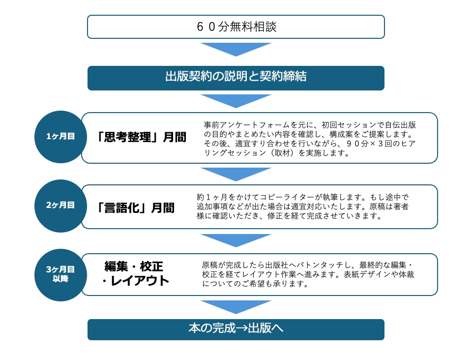 A:初回ビジョン設定セッションと3回の取材(ヒアリングセッション)を行います。時間はそれぞれ90分を目安としてください。原稿完成後、提携出版社への引き継ぎ打ち合わせがございます。